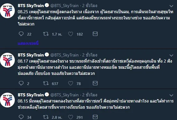 15 ส.ค. 2561 ทวิตเตอร์ BTS SkyTrain ของรถไฟฟ้าบีทีเอส รายงาน เมื่อเวลา 08.17 น. เกิดอุบัติเหตุ ผู้โดยสารหญิงตกลงในรางรถไฟฟ้าบีทีเอสสถานีราชเทวี เนื่องจากเป็นลม ทำให้ขบวนรถที่กำลังเข้าที่สถานีราชเทวีต้องหยุดฉุกเฉิน ทั้ง 2 ฝั่ง