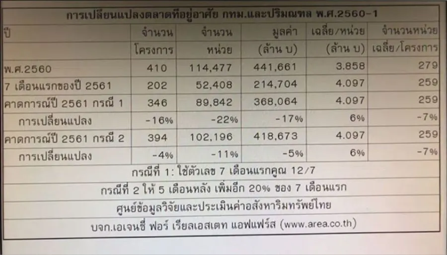 จากการสำรวจข้อมูลภาคสนามของศูนย์ข้อมูลวิจัยและประเมินค่าอสังหาริมทรัพย์ไทย บจก.เอเจนซี่ ฟอร์ เรียลเอสเตท แอฟแฟร์ส (www.area.co.th) ที่ดำเนินการมาอย่างต่อเนื่องตั้งแต่เดือนมกราคม 2537 จนถึงเดือนล่าสุด ดร.โสภณ ประธานศูนย์ข้อมูลฯ พบว่าในรอบ 7 เดือนแรกของปี 2561 มีโครงการเปิดใหม่รวมกัน 202 โครงการ รวม 52,408 หน่วย มูลค่า 214,704 ล้านบาท ราคาเฉลี่ยหน่วยละ 4.097 ล้านบาท แต่ละโครงการมีขนาด 259 หน่วย