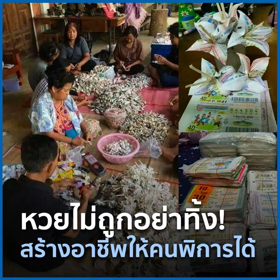 หวยไม่ถูกอย่าเพิ่งทิ้งสลาก...มีคนรับบริจาค สร้างอาชีพให้คนพิการได้ ให้กลุ่มคนรายได้น้อยและคนพิพากนำสลากกินแบ่งรัฐบาลที่ไม่ถูกรางวัลไปใช้ประโยชน์ อย่างเช่น การพับเป็นดอกไม้จันทน์ เพื่อใช้ในพิธีศพ และสามารถทำเป็นสิ่งอื่นๆได้ จึงถือเป็นแนวทางหนึ่งที่สร้างรายได้โดยนำของที่ไม่ได้ใช้มารีไซเคิล