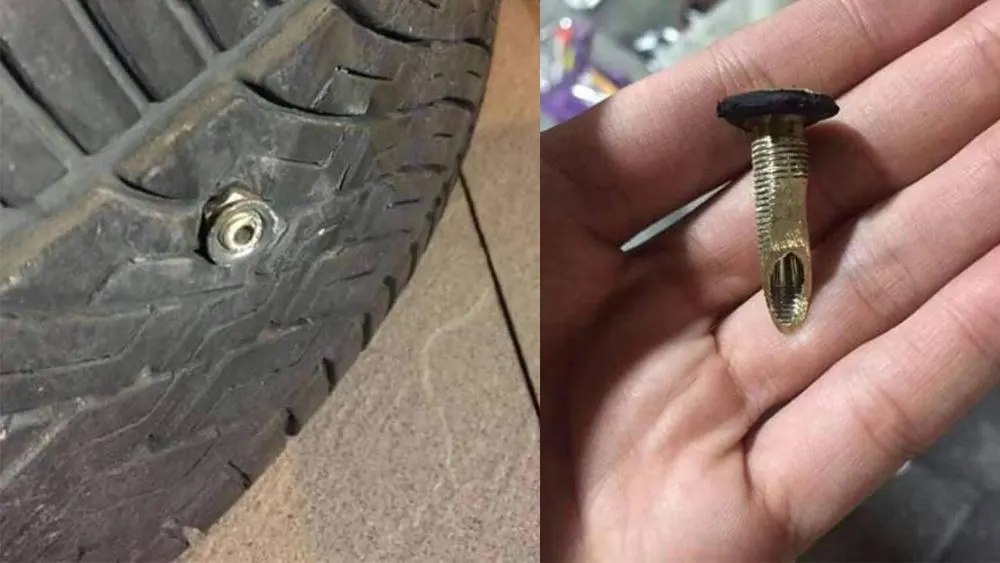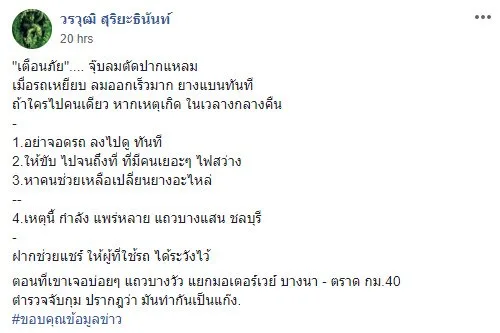 โดยระบุว่า “เตือนภัย จุ๊บลมตัดปากแหลม เมื่อรถเหยียบ ลมออกเร็วมาก ยางแบนทันที ถ้าใครไปคนเดียว หากเกิดเหตุในเวลากลางคืน อย่าจอดรถลงไปดูในทันที่ แต่ให้ขับประคองไปจนถึงที่ที่มีคนเยอะ และไฟสว่าง พร้อมหาคนช่วยเหลือหรือเปลี่ยนยางอะไหล่