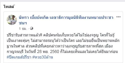 ปรีชารับสารภาพแล้ว!! คลิปคนก้มเก็บหวยได้ไม่ใช่ลุงจรูญ ใครก็ไม่รู้เป็นเงาตะคุ่มๆ ไม่สามารถระบุได้ว่าเป็นใคร เลยไม่ขอยื่นเป็นพยานหลักฐานในศาล ส่วนคลิปที่เคยกล่าวหาว่าลุงจรูญรับสารภาพที่สภ.เมืองกาญจนบุรี ในวันที่ 28 พย. 2560 ก็ไม่เคยเห็นและไม่เคยได้ยินมาก่อน #ปิดเกมส์ปรีชา #หวย30ล้าน