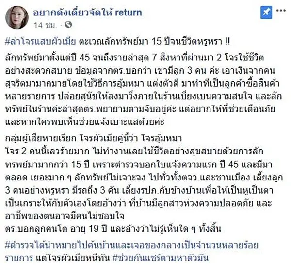 ยังจับไม่ได้กับโจร 2ผัวเมียแสบที่ได้ตะเวนลักทรัพย์มา 15 ปี อย่างโชกโชน เที่ยวตะเวนลักทรัยพย์มาตั้งปต่ ปี 2545 ก่อเหตุทั่วภาคกลาง เผยวัน ๆ ไม่ทำงาน ใช้ชีวิตสุขสบาย มีรถขับ 3 คัน ค้นบ้านเจอทรัพย์สินที่ขโมยมากว่า 100 รายการ เมื่อวันที่ 14 สิงหาคม 2561 เพจ อยากดังเดี๋ยวจัดให้ return ได้หยิบยกคดีลักทรัพย์น่าสนใจคดีหนึ่ง ซึ่งคนร้ายเป็นสองสามีภรรยา ตระเวนก่อเหตุลักทรัพย์มาอย่างโชกโชนถึง 15 ปี !! โดยหมายจับคดีแรกคือปี 2545 และมีมาตลอด กระทั่งล่าสุด เจ้าหน้าที่ตำรวจปทุมธานี ได้นำหมายค้นบุกบ้านของผู้ต้องหาที่ จ.นนทบุรี เจอทรัพย์สินที่ฉกฉวยมากว่า 100 รายการ แต่คนร้ายไหวตัวทัน หลบหนีไปได้ คือ นายอภิชาติ อายุ 42 ปี และนางฑิญาตา อายุ 38 ปี ข้อมูลจากตำรวจระบุว่า โจรคู่นี้จะแต่งตัวดี ใช้วิธีการไปยังร้านค้าต่าง ๆ แล้วใช้สุนัขที่อุ้มมาด้วยเป็นตัวเบี่ยงเบนความสนใจโดยการปล่อยให้สุนัขวิ่งเล่นในร้าน จากนั้นจึงฉวยจังหวะขโมยทรัพย์สิน จนกลุ่มผู้เสียหายเรียกโจรคู่นี้ว่า โจรอุ้มหมา เพจดังกล่าวยังระบุอีกด้วยว่าทั้งคู่ไม่ทำงานอะไรเลย ยังชืพมาด้วยการลักทรัพย์มาโดยตลอด ใช้ชีวิตอย่างสุขสบาย มีรถขับ 3 คัน และยังใจดี เปย์รปภ.หน้าหมู่บ้าน และเพื่อนบ้าน เพื่อเป็นหูเป็นตาให้กับตัวเอง โดยอ้างว่าที่บ้านนั้นมีลูกสาว