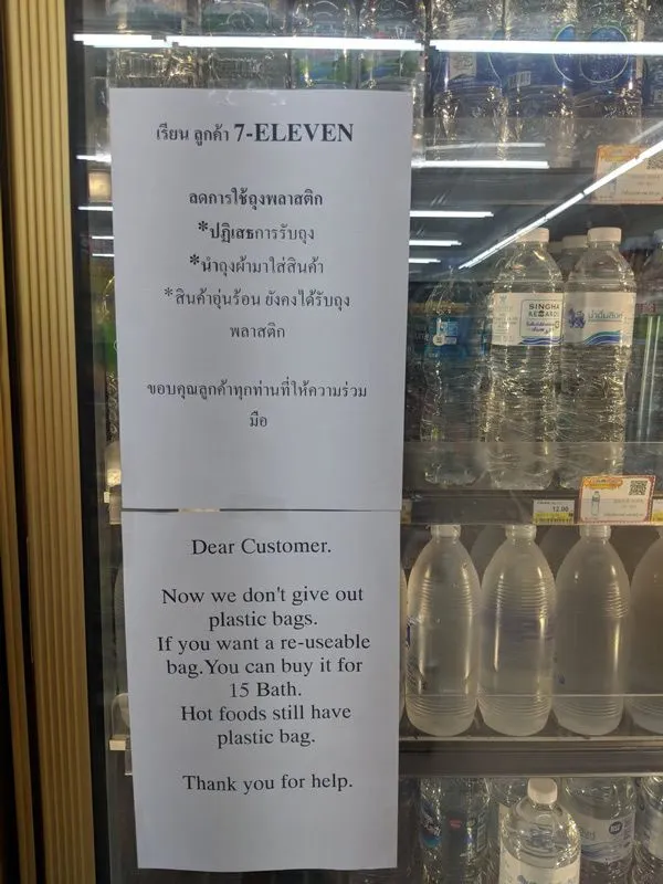 18 สิงหาคม 2561 ผู้ใช้ทวิตเตอร์ @travel2getherth ทวีตภาพร้านสะดวกซื้อแห่งหนึ่งที่ เกาะเต่า จ.สุราษฎร์ธานี ได้ยกเลิกการแจกถุงพลาสติกให้กับลูกค้า โดยจะให้เฉพาะตอนซื้ออาหารอุ่นร้อนเท่านั้น เปิดโอกาสให้หลาย ๆ คนหันมาใช้ถุงผ้าในการใส่สินค้าแทน ลังจากที่นโยบายดังกล่าวถูกนำมาใช้ พบว่าลูกค้าส่วนใหญ่ก็สามารถปรับตัวได้แล้วเช่นกัน โดยเฉพาะภาพที่ชาวต่างชาติรายหนึ่งได้นำถังใบใหญ่มาใช้แทนถุง เช่นเดียวกับหลาย ๆ คนที่ต่างพกถุงผ้ามาใส่สินค้า