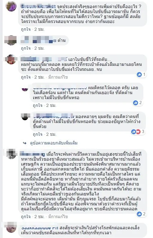 บางคนให้ความเห็นว่า จุดประสงค์จริงๆของการเพิ่มค่าปรับคืออะไร ? ถ้าคำตอบคือ เพื่อไม่ให้คนที่ไม่ได้สอบใบขับขี่เอารถมาขับ ก็ควรจะปรับปรุงระบบการตรวจสอบไม่ดีกว่าไหม? ฐานข้อมูลก็มี สงสัยใครว่าจะไม่มีก็ตรวจสอบจากระบบ ง่ายกว่ากันเยอะ