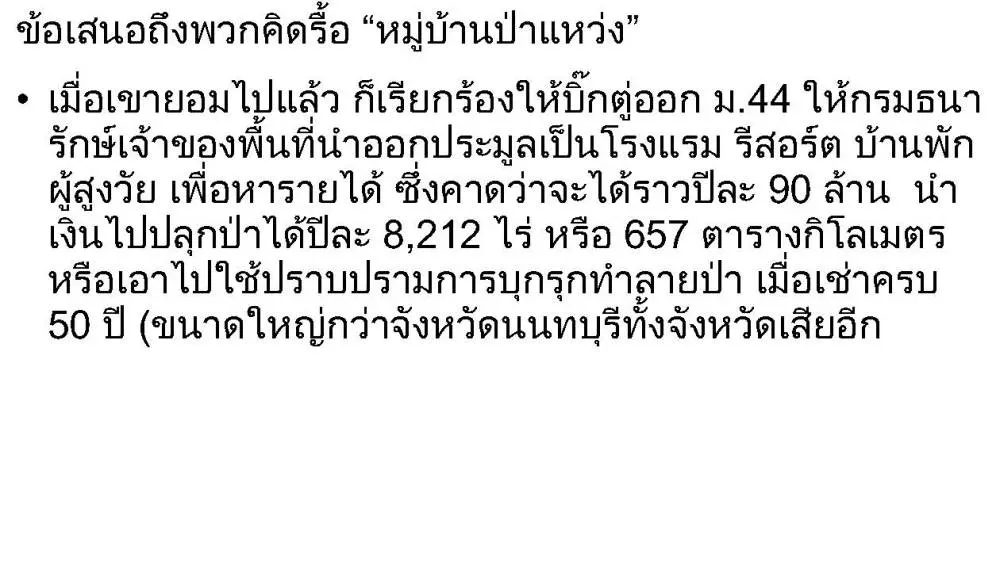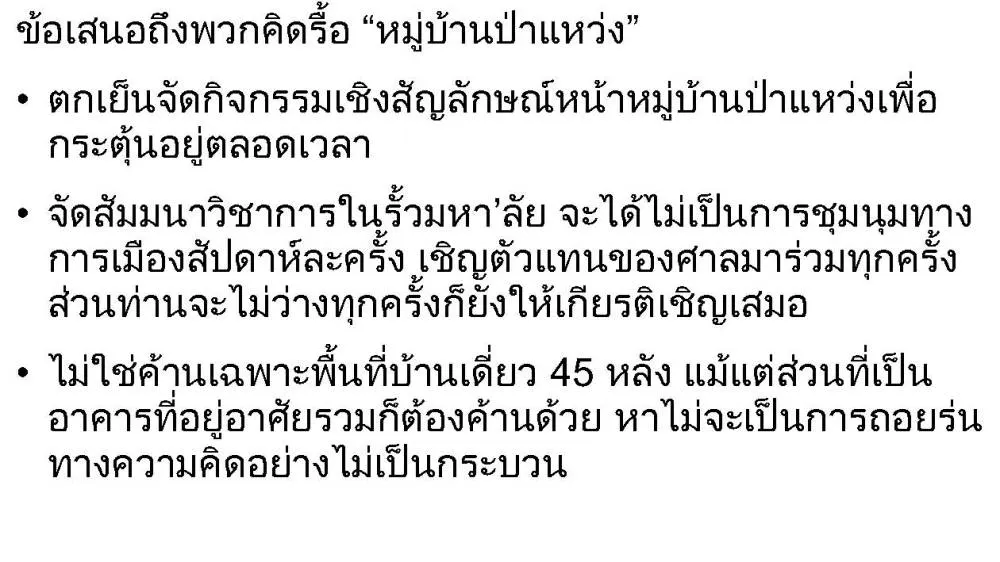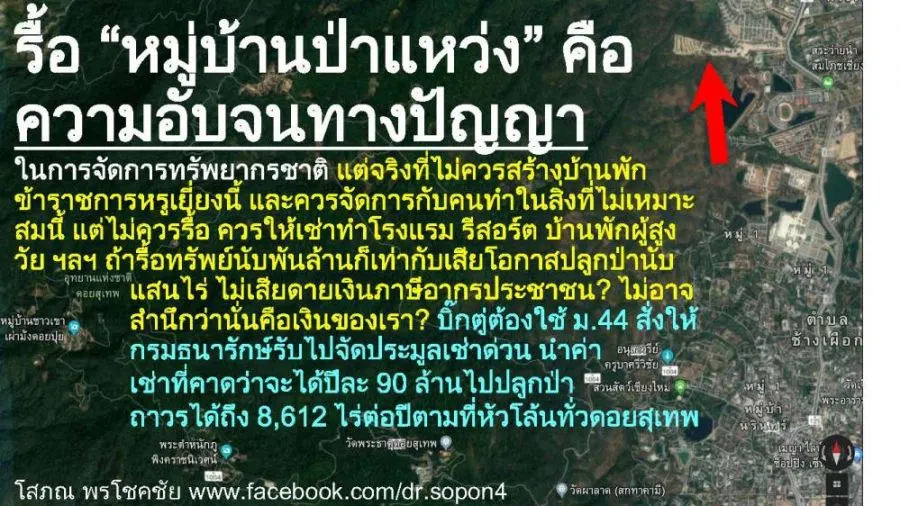 ดร.โสภณ Live สดชี้ให้เห็นว่าถ้าหากคณะที่เรียกร้องให้รื้อบ้านป่าแหว่ง สามารถเชิญศาลให้ออกไปจากหมู่บ้านป่าแหว่งได้ ก็ควรเอามาให้เช่าทำรีสอร์ต เอาเงินไปปลูกป่าบนดอยสุเทพที่มีผู้บุกรุกมากมายดีกว่า
