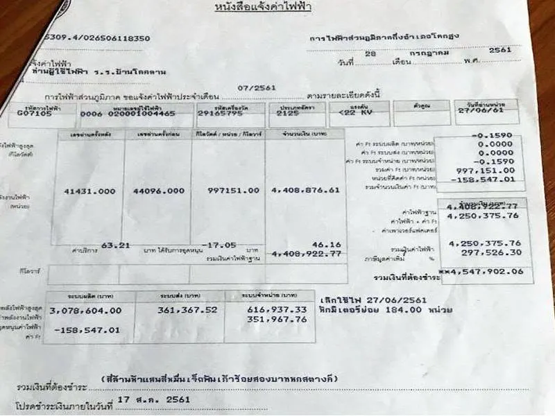 แต่บิลค่าไฟฟ้าก็ยังคงมีมาเดือนละ 334.10 กว่าบาท ไม่ถึง 300 บาทบ้างในเดือน มิ.ย.และ ก.ค.61 ทางโรงเรียนจึงทำหนังสือขอยกเลิกหมอเก่าไปอีกครั้ง เป็นรอบที่ 2 แต่ปรากฏว่า บิลสุดท้ายของหม้อนี้ที่ส่งมาเมื่อวันที่ 20 สิงหาคมที่ผ่านมา เป็นเงินสูงถึง 4.5 ล้านบาท