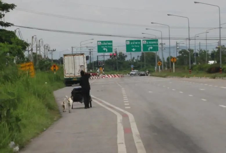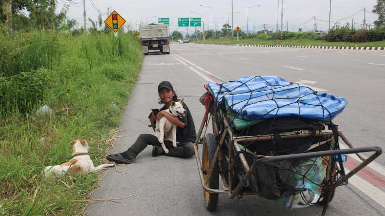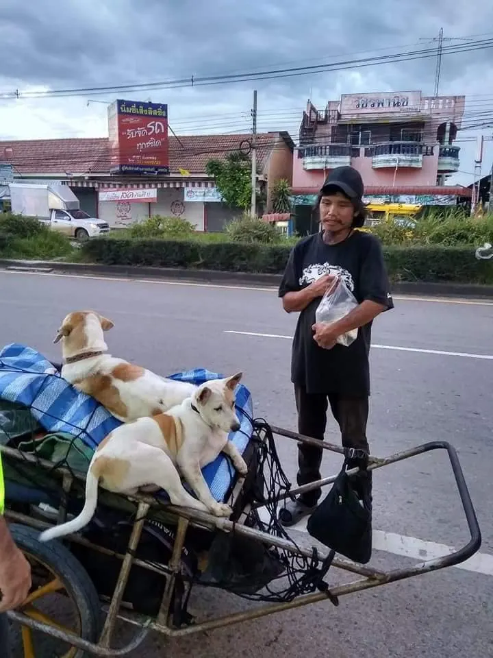 พี่ศักดิ์ชัยได้เดินเท้ามาตั้งแต่เดือนมกราคม 2560 แล้ว โดยออกจากจังหวัดตรัง มาค่ำไหนนอนที่นั่น ตลอดทางมีชาวบ้านคอยช่วยเหลือ บางทีก็นอนป่าช้า นอนวัดบ้าง บางทีก็ริมถนน ที่ทำนี้เพราะเคยให้สัญญาไว้กับแฟนว่าจะพาไปเที่ยวดอยอินทนนท์ เมื่อแฟนได้เสียชีวิตลงเมื่อเดือนตุลาคม ปี 2559 จึงได้ตั้งใจแน่วแน่ว่าจะพาแฟนไปทำบุญและโปรยอัฐิบนดอยอินทนนท์ ระหว่างทางก็ได้เพื่อนร่วมเดินทางมาคือ สุนัขตัวแรกชื่อ "กระเช้า" จากจังหวัดสมุทรปราการ และ "นะโม" จากจังหวัดพิษณุโลก โดยพบเจอเป็นสุนัขพลัดหลงมาหรือถูกทิ้งไว้ข้างทาง และวันนี้ก็เจอลูกแมวดำหนึ่งตัวอาศัยอยู่ในพงหญ้าข้างทาง จึงเก็บมาเลี้ยงร่วมเดินทางด้วยกัน