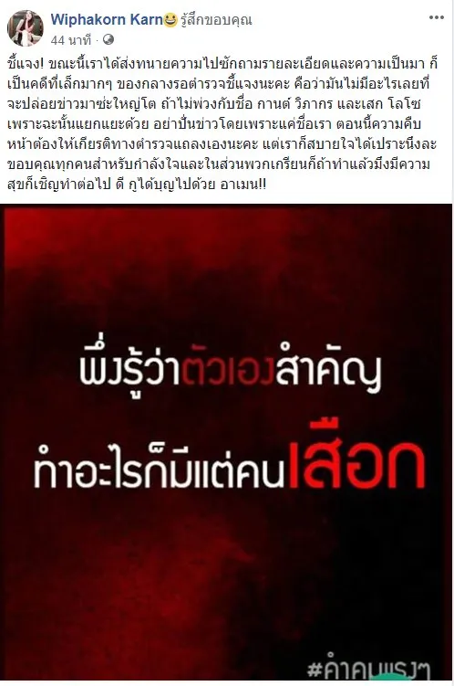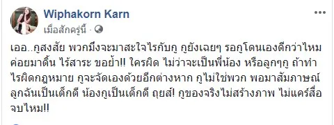 และอีกโพสท์ระบุว่า เออ..กูสงสัย พวก...จะมาสะใจไรกับกู กูยังเฉยๆ รอกูโดนเองดีกว่าไหมค่อยมาดิ้น ไร้สาระ ขอย้ำ!! ใครผิด ไม่ว่าจะเป็นพี่น้อง หรือลูกๆกู ถ้าทำไรผิดกฎหมาย กูจะจัดเองด้วยอีกต่างหาก กูไม่ใช่พวก พอมาสัมภาษณ์ ลูกฉันเป็นเด็กดี น้องกูเป็นเด็กดี ถุยส์! กูของจริงไม่สร้างภาพ ไม่แคร์สื่อ จบไหม!!