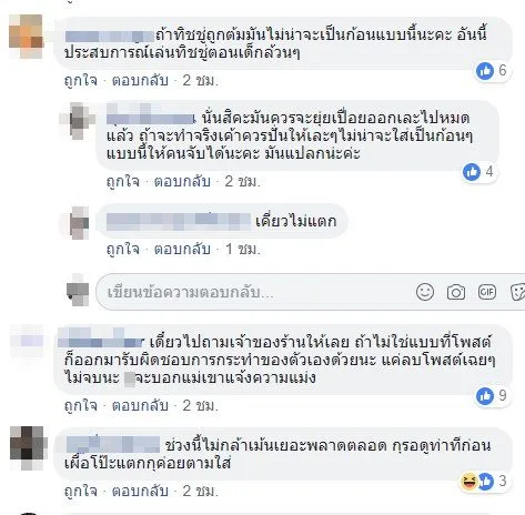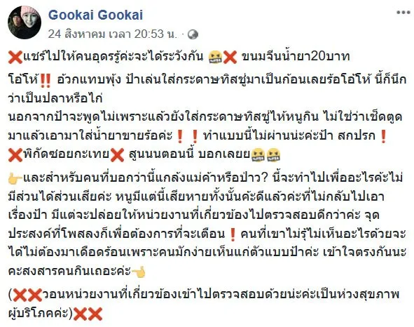 และสำหรับคนที่บอกว่านี้แกล้งแม่ค้าหรือป่าว? นี้จะทำไปเพื่ออะไรค้ะไม่มีส่วนได้ส่วนเสียค่ะ หนูมีแต่นี้เสียหายทั้งนั้นค้ะดีแล้วค่ะที่ไม่กลับไปเอาเรื่องป้า มีแต่จะปล่อยให้หน่วยงานที่เกี่ยวข้องไปตรวจสอบดีกว่าค่ะ จุดประสงค์ที่โพสลงก็เพื่อต้องการที่จะเตือนคนที่เขาไม่รุ้ไม่เห็นอะไรด้วยจะได้ไม่ต้องมาเดือดร้อนเพราะคนมักง่ายเห็นแก่ตัวแบบป้าค่ะ เข้าใจตรงกันนะคะสงสารคนกินเถอะค่ะ