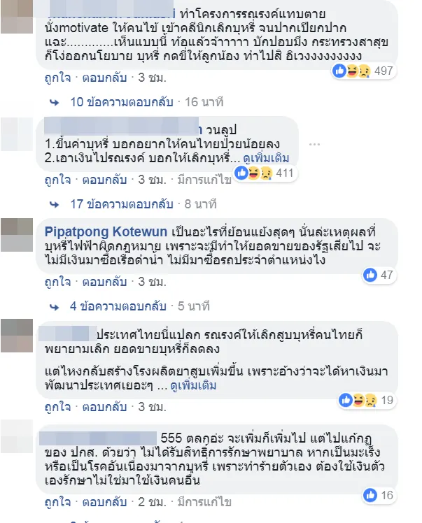 นี่คิดจะสนใจแต่เศรษฐกิจอย่างเดียวหรือไร แล้วที่ทำโครงการรณรงค์แทบตาย นั่งmotivate ให้คนไข้ เข้าคลีนิกเลิกบุหรี่ จนปากเปียกปากแฉะละ ทำไมมันย้อนแย้ง กันแบบนี้ หรือจะส่งออกให้คน ต่างประเทศสูบกัน หรือจะให้คนไทย สูบอย่างฉลาด กับคำเตือนโง่ๆ ข้างซอง.....
