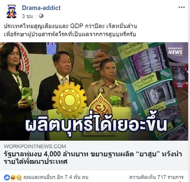 เมื่อเพจ Drama-addict แชร์ข่าว รัฐบาลทุ่มงบ 4,000 ล้านบาท ขยายฐานผลิต “ยาสูบ” หวังนำรายได้พัฒนาประเทศ