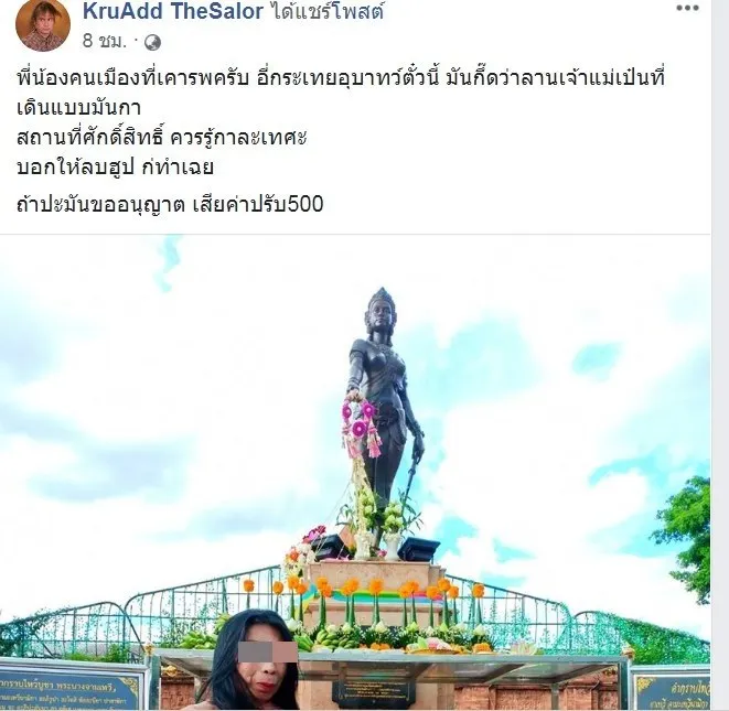 ชาวเน็ตล้านนาจวกยับ!! สาวประเภทสองเน็ตไอดอลสายฮาชื่อดัง สวมชุดวาบหวิวโพสท่าถ่ายภาพคู่กับอนุสาวรีย์เจ้าแม่จามเทวี“ครูแอ๊ด” นายภานุทัต อภิชนาธง ศิลปินพื้นบ้านล้านนาชื่อดัง โพสต์ลงเฟซบุ๊ค KruAdd TheSalor ด้วยการแชร์โพสต์ที่เป็นภาพถ่ายของสาวประเภทสองคนหนึ่งยืนโพสท่าบริเวณหน้าอนุสาวรีย์พระนางจามเทวี เมืองลำพูน ซึ่งเป็นถือเป็นสิ่งศักดิ์สิทธิ์ที่ชาวลำพูนและชาวล้านนาให้ความเคารพนับถือ