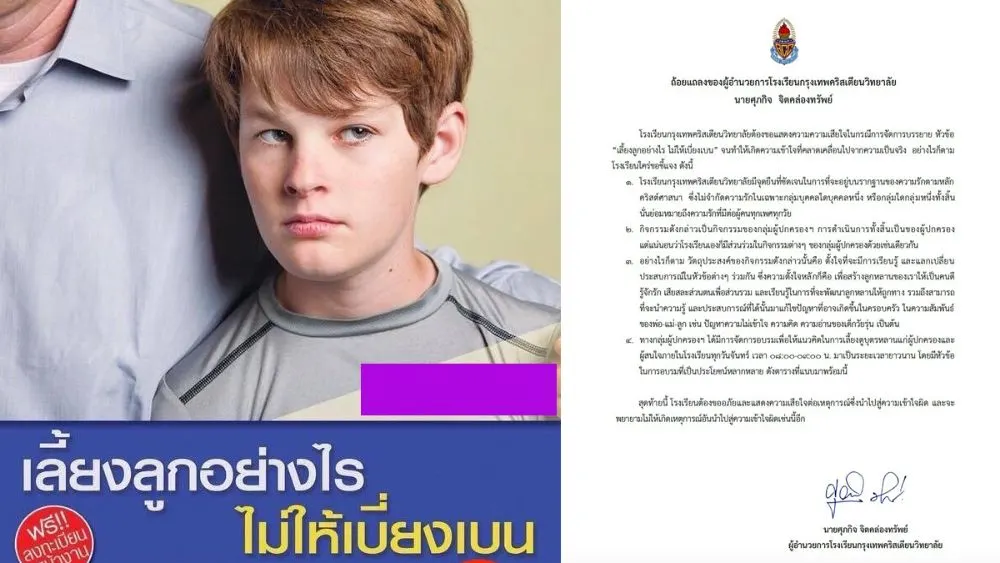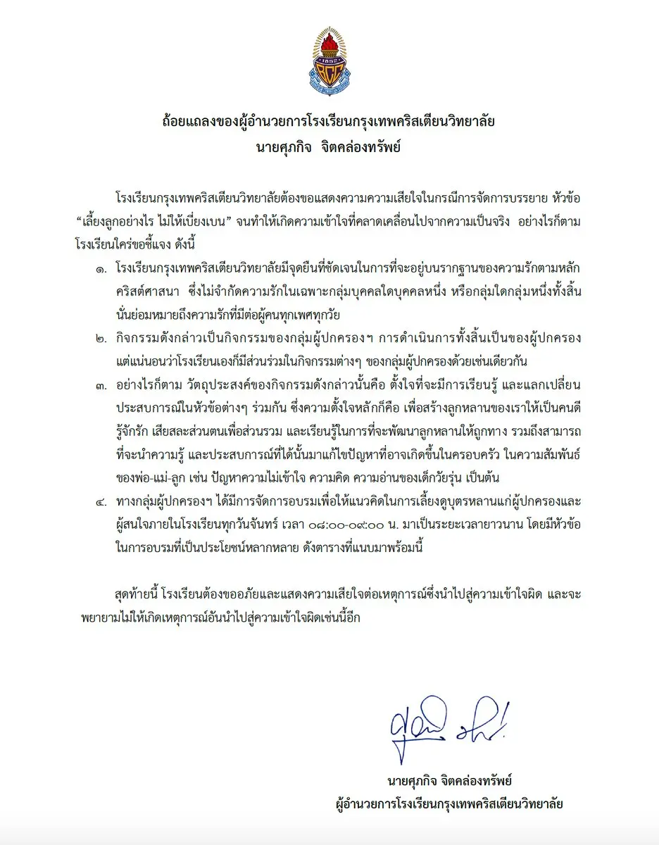 รร.ดังแสดงความเสียใจกรณีการจัดการบรรยาย “เลี้ยงลูกอย่างไร ไม่ให้เบี่ยงเบน”ทำให้เกิดความเข้าใจผิด