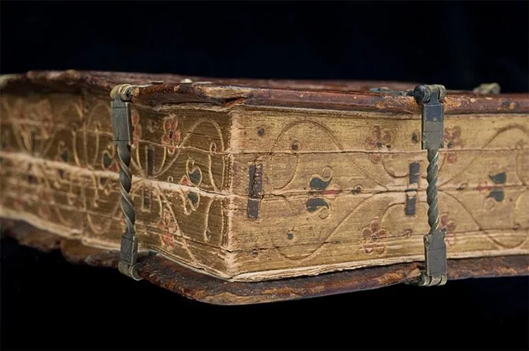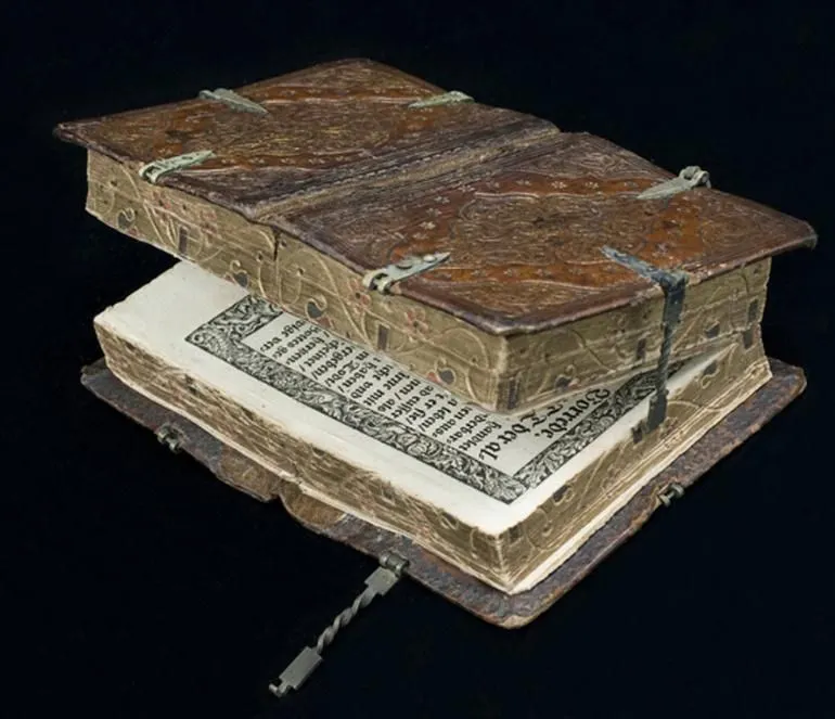 ตัวหนังสือถูกยึดติดไว้ด้วยกันด้วยขอเกี่ยวโลหะ การอ่านแต่ละเล่มนั้นทำได้ด้วยการปลดขอเกี่ยวที่จำเป็นในการเปิดหนังสือในแต่ละด้าน จัดว่าเป็นงานฝีมือล้ำสมัยจากยุคโบราณที่มีแนวคิดก้าวหน้ามากๆ เนื้อหาในหนังสือสุดล้ำจากยุคโบราณนี้ว่าด้วยเรื่องราวเกี่ยวกับศาสนาที่ถูกตีพิมพ์ในเยอรมณีในช่วงปี 1550-1570 ด้วยการจัดพิมพ์แบบพิเศษ หนังสือเล่มนี้จึงอ่านยากอยู่เหมือนกัน แต่ก็ถือว่าเป็นงานที่ยอดเยี่ยม บทความในหนังสือนั้นมีทั้งของ Martin Luther และ Der kleine Catechismus