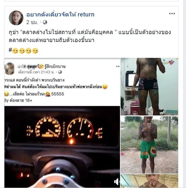 เพจ อยากดังเดี๋ยวจัดให้ return โพสต์ภาพ แก๊งเบิร์นยางไร้ความสำนึก ทั้ง โพสต์ "ด่าผมได้ แต่ให้ผมไปเบิร์นยางบนหัวพ่อ_ก่อน"