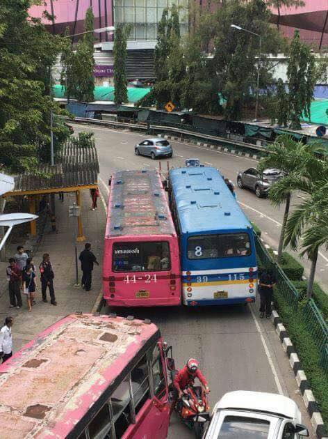 วันที่ 1 กันยายน 2561 เวลา 16.00น. รถเมล์ สาย 8 เบียดกับรถเมล์สาย 44 หน้าป้ายรถเมล์ ข้างเซ็นทรัล ลาดพร้าว จะขึ้นสะพานมุ่งหน้าไปยูเนี