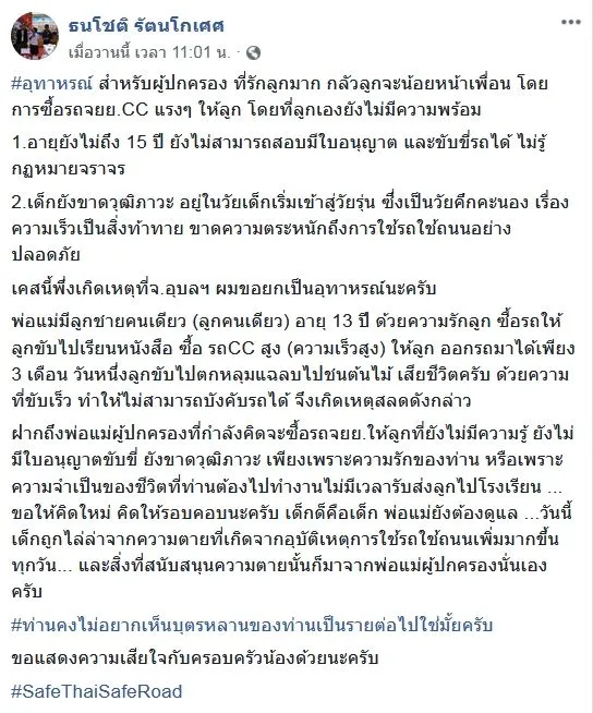 ผู้ใช้เฟสบุคชื่อ @ ธนโชติ รัตนโกเศศ โพสเรื่องราวว่า ...#อุทาหรณ์ สำหรับผู้ปกครอง ที่รักลูกมาก กลัวลูกจะน้อยหน้าเพื่อน โดยการซื้อรถจยย.CC แรงๆ ให้ลูก โดยที่ลูกเองยังไม่มีความพร้อม