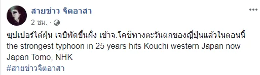 นอกจากนี้ในเฟซบุ๊กของ สายข่าว จิตอาสา ได้เผยแพร่ภาพฝนตกหนัก ขณะที่ซุปเปอร์ไต้ฝุ่นเชบี พัดขึ้นฝั่งของญี่ปุ่น ระบุข้อความว่า "ซุปเปอร์ไต้ฝุ่น เชบuพัดขึ้นฝั่ง เข้าจ.โคชิทางตะวันตกของญี่ปุ่นแล้วในตอนนี้ the strongest typhoon in 25 years hits Kouchi western Japan now Japan Tomo, NHK"