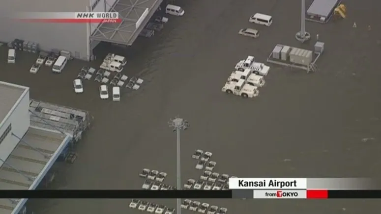 สนามบินคันไซ สนามบินลอยน้ำแห่งแรกของโลก ตั้งอยู่บนเกาะ เทียมที่มนุษย์ทำขึ้นยื่นเข้าไปในทะเลเซนชูของอ่าวโอซากา จำนวนผู้โดยสารที่ใช้สนามบินนี้ประมาณ 20 ล้านคนต่อปี แต่ผู้โดยสารที่เดินทางช่วงนี้จะลำบากที่สุด ติดอยู่ในสนามบินที่น้ำ-ไฟหรือแม้แต่อาหารแทบไม่มี หลังไต้ฝุ่นเชบีเข้าโอซาก้า