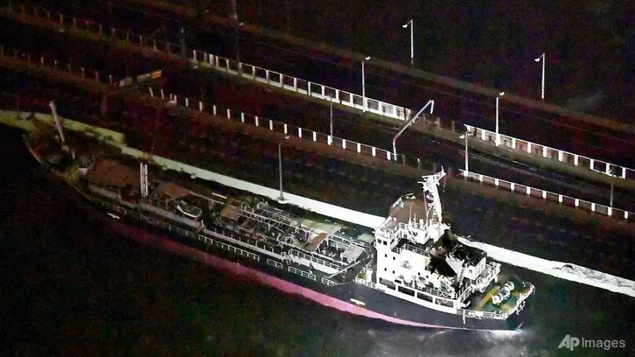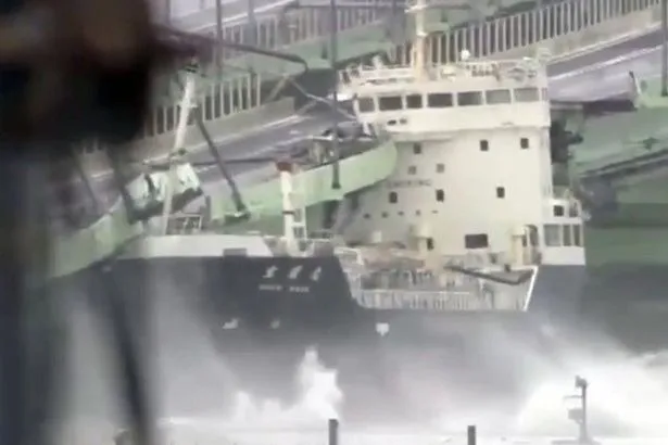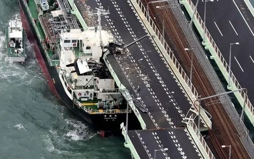 ลมแรง คลื่นสูง พัดเรือบรรทุกน้ำมันชนสะพานที่เชื่อมสนามบินนานาชาติคันไซเข้ากับเมืองอิซุมิซาโนะ ในเขตโอซากา เสียหาย