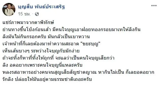 นอกจากนี้ ผู้โพสต์ยังระบุด้วยว่า การนำอาหารที่เป็นของคนมาให้สัตว์นั้น จะส่งผลต่อสุขภาพของสัตว์ป่า และยังทำให้สูญเสียสัญชาตญาณในการอาหารกินตามปกติไป เพราะติดในรสชาติของอาหารคน