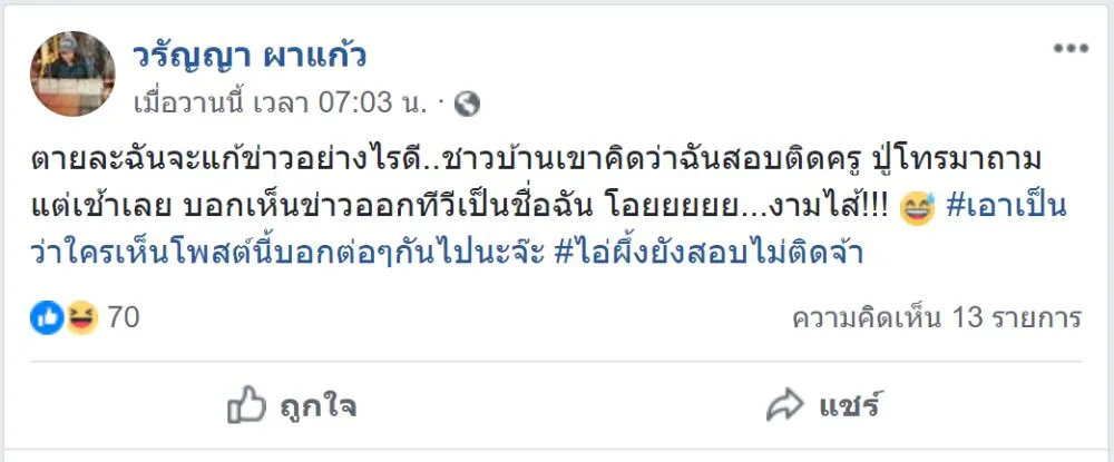 จากคลิปที่เป็นกระแสไปอย่างกว้างขวาง กับสาวท่านหนึ่ง ที่มีข่าวว่าสอบติดครูผู้ช่วยได้ แต่ต้องร้องไห้หนัก เพราะไม่มีเงินไปจ้างลิเกเพื่อแก้บน ล่าสุดเฟซบุคของเจ้าตัว ได้ออกมาแก้ข่าวแล้วว่า เป็นคลิปที่ทำขึ้นมาขำๆ อีกทั้งยังสอบไม่ติดครูอีกด้วย