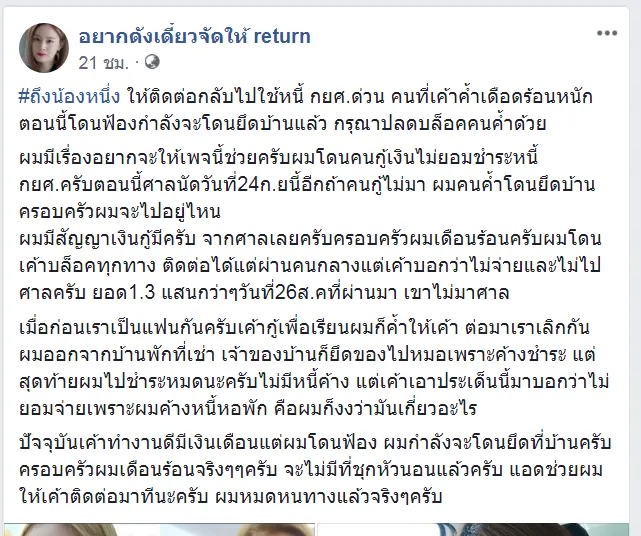 เพจ อยากดังเดี๋ยวจัดให้ return ร่วมทวงหนี กยศ. !! หลังหนุ่ม ลูกเพจ ส่งเรื่อราวมาให้ จากที่ อดีตแฟนสาว กู้ กยศ. แล้ว ชักดาบไม่จ่ายหนี้กันอีก เดือดร้อนตนเองเป็นผู้ค้ำละทีนี้