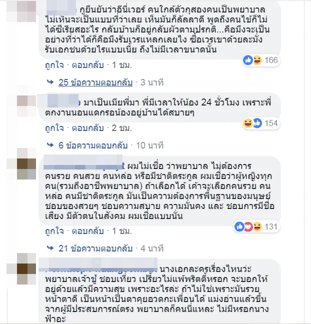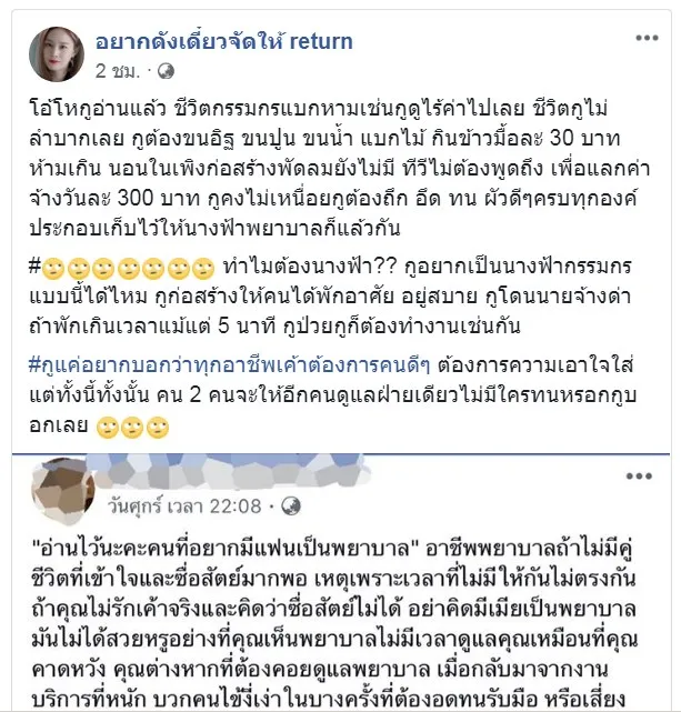 โอ้โหกูอ่านแล้ว ชีวิตกรรมกรแบกหามเช่นกูดูไร้ค่าไปเลย ชีวิตกูไม่ลำบากเลย กูต้องขนอิฐ ขนปูน ขนน้ำ แบกไม้ กินข้าวมื้อละ 30 บาทห้ามเกิน นอนในเพิงก่อสร้างพัดลมยังไม่มี ทีวีไม่ต้องพูดถึง เพื่อแลกค่าจ้างวันละ 300 บาท กูคงไม่เหนื่อยกูต้องถึก อึด ทน ผัวดีๆครบทุกองค์ประกอบเก็บไว้ให้นางฟ้าพยาบาลก็แล้วกัน