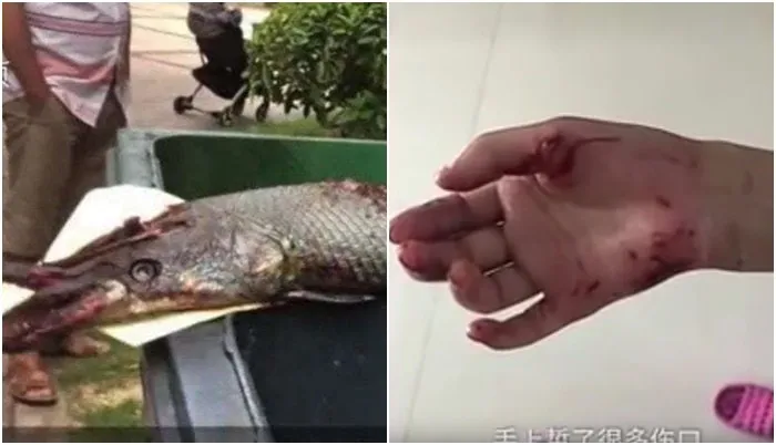 สุดซวย!! เด็กหญิง 9 ขวบ ให้อาหารปลาอยู่ดีๆ โดนปลายักษ์จู่โจมมือเหวอะ (มีคลิป)