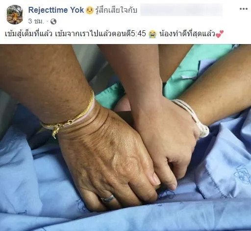 โดยผู้ใช้เฟซบุ๊กชื่อว่า Rejecttime Yok ได้โพสต์ข้อความว่า “เข้มสู้เต็มที่แล้ว เข้มจากเราไปแล้วตอนตี5:45 😭 น้องทำดีที่สุดแล้ว💕”