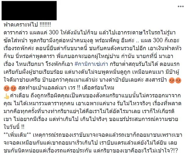 ฟาดเคราะห์ไป !!!!!!! ดารากล่าว แผลแค่ 300 ให้ตังมันไปก็จบ แล้วไปเอากระดาษไรในรถไม่รู้มาซัดใส่หน้า พูดกริยา...กูต่อหน้าคนมุงดู พร้อมฟัคยู อืมค่ะ .. แผล 300 ก็เถอะ เรื่องรถพักค่ะ ตอนนี้ยืนด่ากันขนาดนี้ ชนกับคนดังคนรวยไปอีก เอาเงินฟาดหัวก็จบ นี่หรอคำพูดดารา พี่แกบอกจะบอกผู้ใหญ่บ้าน กำนัน นายกที่นี่ มาเอาเรื่อง ไหนเรียกมา โรงพักก็เอา #กามิกาเซ่เก่า กริยาต่ำสถุนรับไม่ได้ ตอนแรกเครียกับฝั่งผู้ชายเรียบร้อย แต่นางดันไม่จบพูดหมิ่นดูถูก เหมือนคนเมา มีป้าผู้ใจดีมาช่วยเครีย ป้าบอกว่าคุณเมาแล้วน่ะ นางด่าป้ายับเลยค่ะ สงสารป้า สุดท้ายเป่าแอลล์เมา เวร !! เดือดร้อนไหม