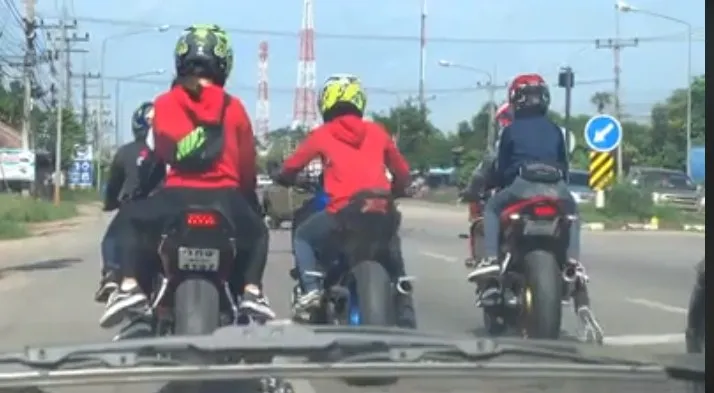 บันทึกภาพโดยผู้ขับรถยนต์ตามหลัง กลุ่มรถจักรยานยนต์บิ๊กไบค์ 4 คัน บนถนนสายห้วยไผ่-น้ำพุ เขต อ.เมือง จ.ราชบุรี แล้วเผยแพร่ในเฟซบุ๊กกลุ่มไชโยราชบุรี
