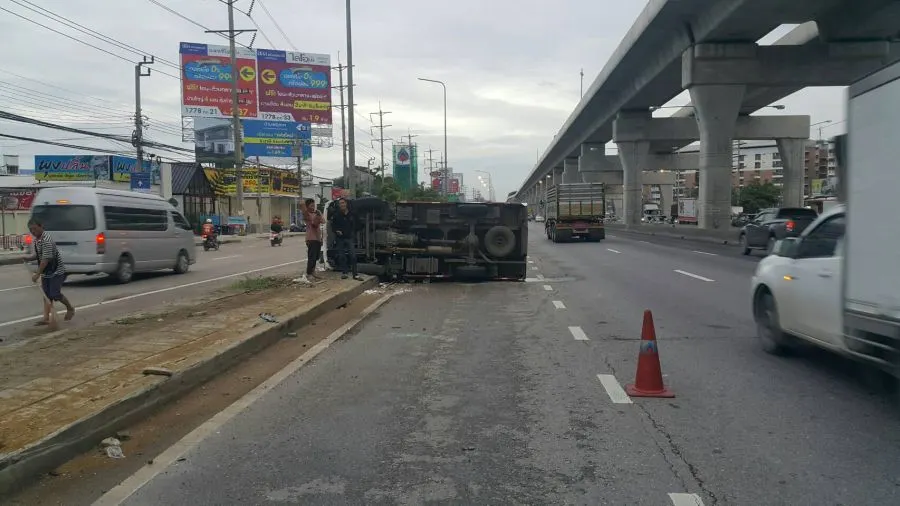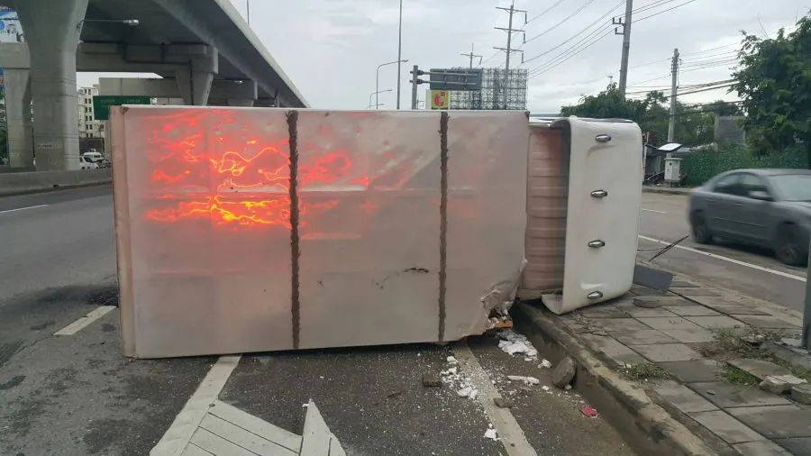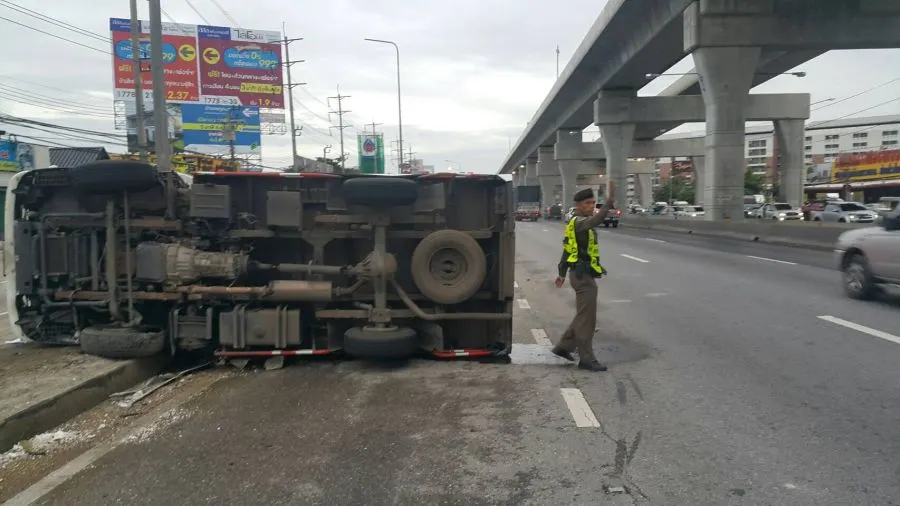 รถบรรทุกเสียหลัก พลิกตะแคงกลางถนน