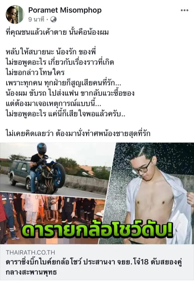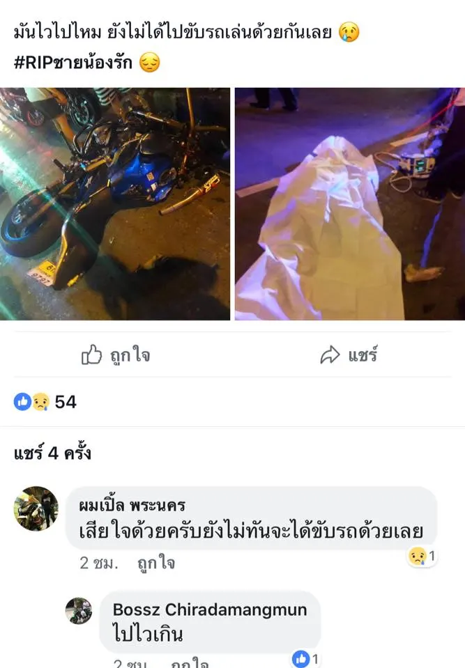 เพจRed Skull Z โพสต์ภาพแฉ ชายวัย 19 ปี หนุ่มขี่บิ๊กไบค์ยกล้อ จนชนคันอื่นเสียชีวิต เคยมาคอมเมนต์เอาไว้ ในลักษณะด่ากลับคนที่มาเตือนเรื่องการขับขี่แบบยกล้อ โดยบอกว่า ตนเองนั้นยกเป็น เพราะฝึกมานาน ยกแล้วไม่หงายด้วย และยังบอกด้วยว่า ขับล้อเดียวมันไปชนรถคนหรือยังไงวะ ขำ พร้อมกับขอบคุณแฟนคลับทุกคนด้วย