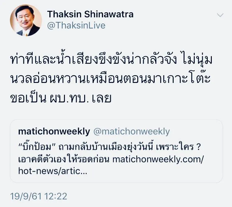 — Thaksin Shinawatra (@ThaksinLive) 19 กันยายน 2561