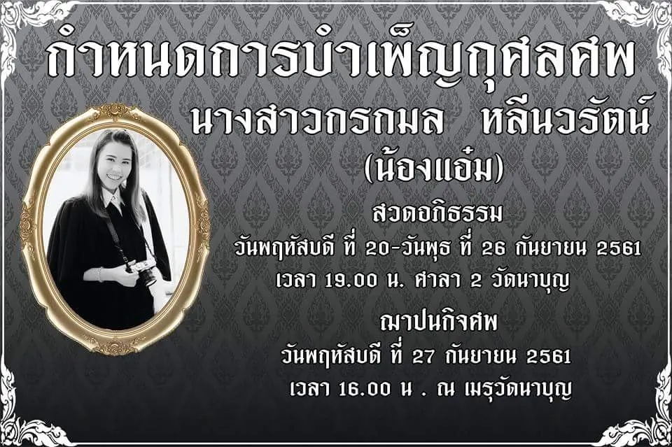 ทั้งนี้ จะมีการกำหนดการบำเพ็ญกุศลศพ นางสาวกรกมล หลีนวรัตน์ (น้องแอ๋ม)