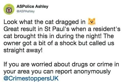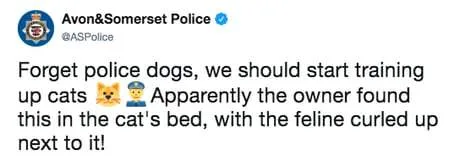 ขณะเดียวกัน ตำรวจเอวอนและซอมเมอร์เซ็ท ได้โพสต์เรื่องราวดังกล่าวบนTwitter พร้อมกับรูปภาพของสิ่งที่แมวลากเข้ามาเก็บไว้ในบ้าน และระบุข้อความว่า "เราน่าจะเปลี่ยนจากการฝึกสุนัขตำรวจมาเป็นฝึกแมวบ้างดีกว่า"