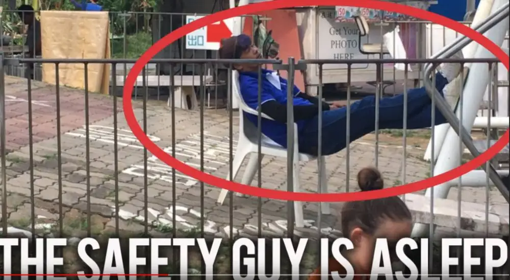 ครอบครัวนี้ได้ไปเล่นเครื่องเล่น (คือกระโดด หอคอย ที่มีความสูง 240 เมตร) แต่พนักงานกลับทำนิสัย ไม่ดูแลความปลอดภัย และยังใช้อารมณ์กับ แขก ที่กระโดดหอคอย ซึ่งในคลิบ ได้มีการถ่ายภาพให้ดูถึงการปฏิบัติหน้าที่ของ (พนักงานเครื่องเล่น)