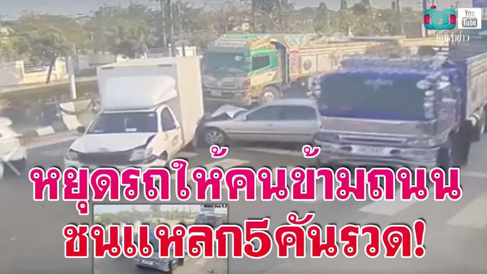 หยุดรถให้คนข้ามถนน ชนเเหลก5คันรวด!