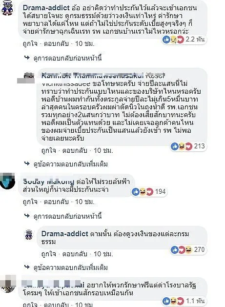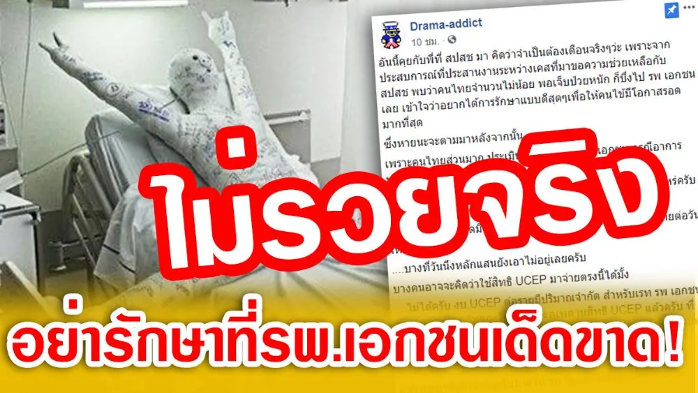 เพจ Drama-addict ได้โพสต์เตือนเรื่องการรักษาพยาบาล โดยเตือนว่าหากเจ็บป่วยหนัก อย่าคิดว่าทำประกันแล้วจะไปรพ.เอกชนได้อย่างสบายๆ ซึ่งถ้าไม่รวยจริงอย่าเข้าโรงพยาบาลเอกชน เพราะอาจหมดตัวได้ แนะนำสำหรับคนจนถึงฐานะปานกลาง ให้มารพ.รัฐดีที่สุด