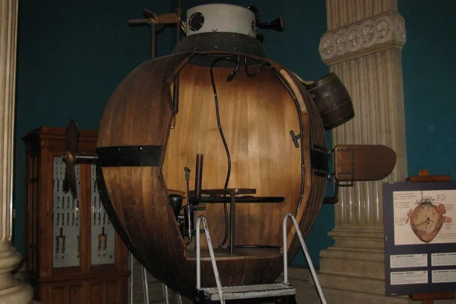 ในช่วงสงครามปฏิวัติ เดวิด บูชเนล (David Bushnell) นักประดิษฐ์ชาวอเมริกัน ได้สร้างเรือใต้น้ำลำแรกของโลกขึ้น เพื่อใช้ในการรบที่ขนานนามว่าอเมริกันเทอร์เทิล (American Turtle) ซึ่งสามารถขนทุ่นระเบิดใต้น้ำพร้อมผู้โดยสารได้ โครงสร้างที่เหมือนลูกโอ๊คสามารถลอยขึ้น ดำลง และเดินหน้าหลังได้ มีห้องภายในที่สามารถบรรจุน้ำเพื่อควบคุมการลอยตัวและใบพัดแนวตั้งบนหลังคาช่วยให้ลอยขึ้นสูงในน้ำได้ แต่ความพยายามทั้งหมดในการใช้สิ่งนี้ต่อกรกับราชนาวีอังกฤษล้มเหลว และการออกแบบนี้ได้ถูกเปิดเผยโดยโทมัส เจฟเฟอร์สัน (Thomas Jefferson)ในการบรรยายในปี 1787