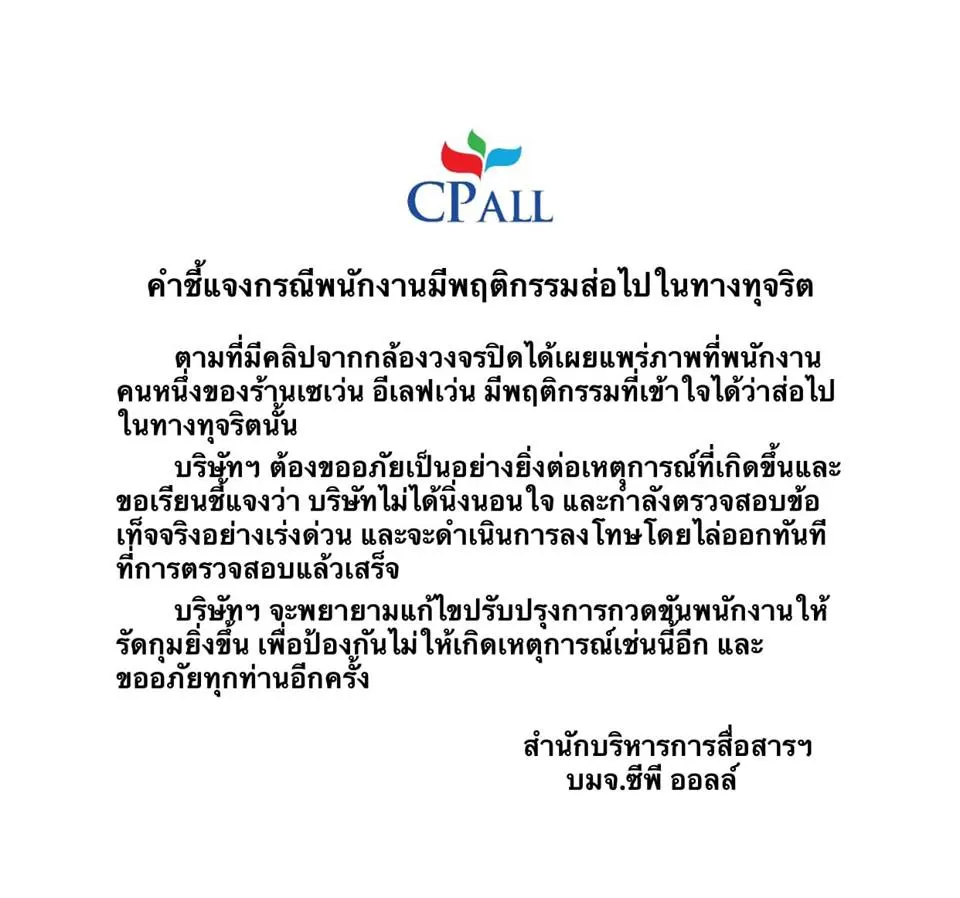 “คำชี้เเจงกรณีพนักงานมีพฤติกรรมส่อไปในทางทุจริต ตามที่มีคลิปจากกล้องวงจรปิดได้เผยเเพร่ภาพพนักงานคนหนึ่งของร้านเซเว่น อีเลฟเว่น มีพฤติกรรมที่เข้าใจได้ว่าส่อไปในทางทุจริตนั้น บริษัทฯ ต้องขออภัยเป็นอย่างยิ่งต่อเหตุการณ์ที่เกิดขึ้นเเละขอเรียนชี้เเจงว่า บริษัทไม่ได้นิ่งนอนใจ เเละกำลังตรวจสอบข้อเท็จจริงอย่างเร่งด่วน เเละจะดำเนินการลงโทษโดยไล่ออกทันทีที่การตรวจสอบเเล้วเสร็จ บริษัทฯจะพยายามเเก้ไขปรับปรุงการกวดขันพนักงานให้รัดกุมยิ่งขึ้น เพื่อป้องกันไม่ให้เกิดเหตุการณ์เช่นนี้อีก เเละขออภัยทุกท่านอีกครั้ง”