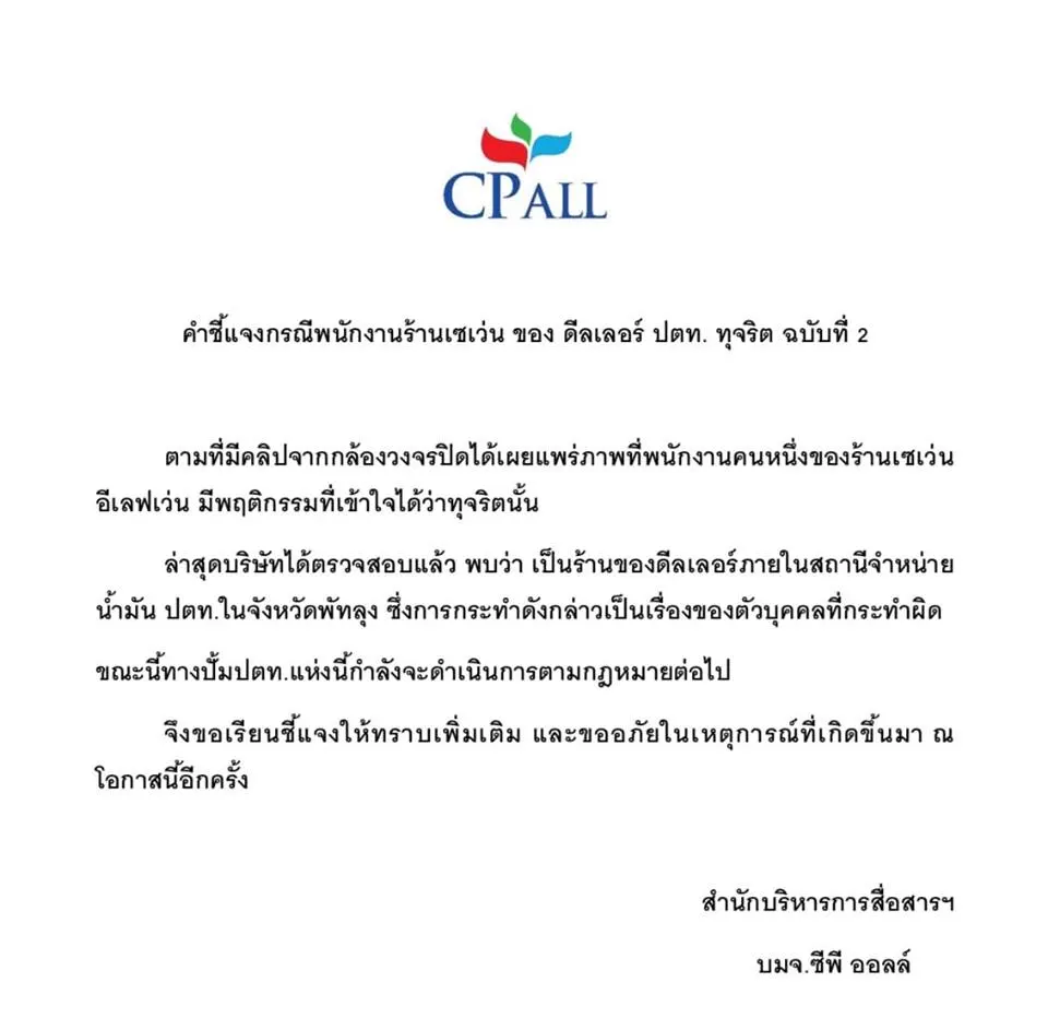 ล่าสุดบริษัท ซีพี ออลล์ จำกัด ได้ออกเเถลงการณ์ฉบับที่2อีกครั้งโดย ระบุว่า” คำชี้เเจงกรณีพนักงานร้านเซเว่น ของดีลเลอร์ปตท.ทุจริต ฉบับที่2 ตามที่คลิปจากกล้องวงจรปิดได้เผยเเพร่ที่พนักงานคนหนึ่งของร้านเซเว่นอีเลฟเว่น มีพฤติกรรมที่เข้าใจได้ว่าทุจริตนั้น