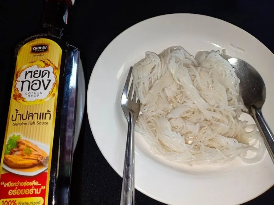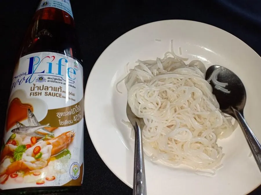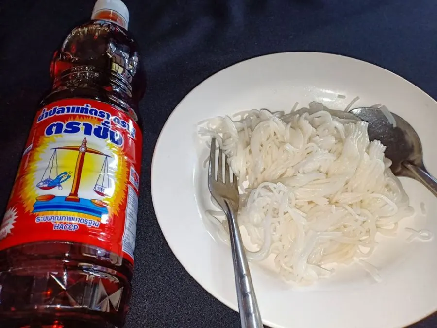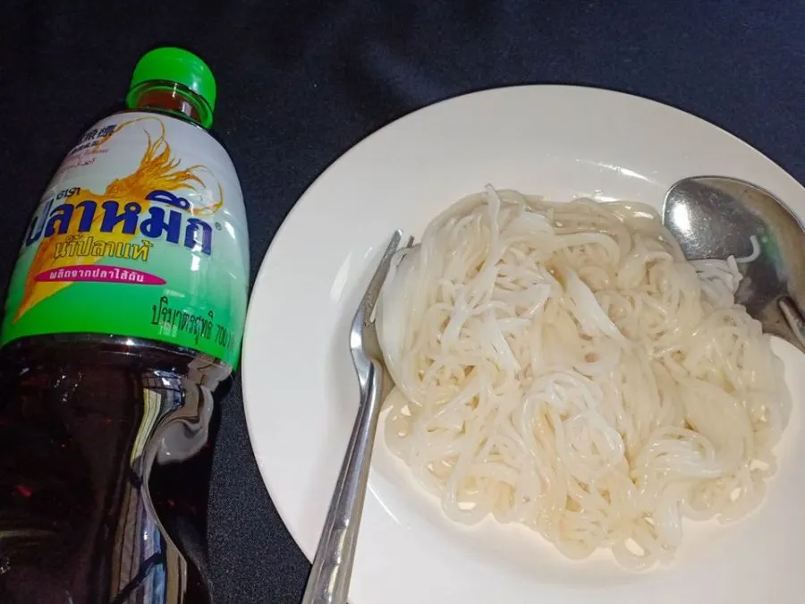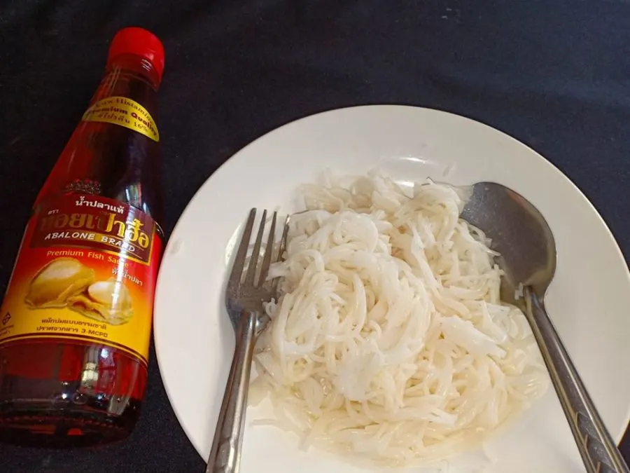 #น้ำปลาตราปลาหมึก ความเค็มเคลืบเส้นดี แต่พอเคี้ยวๆซักพักความจืดๆ