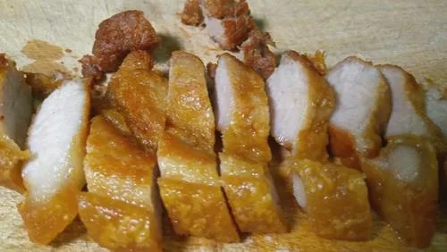 หนังฟูกรอบดีเหมือนกันนะคะ นี่ตาไม่ได้ใช้ส้อมจิ้มเลยนะคะ แต่ถ้าจิ้มหนังอาจจะกรอบมากกว่านี้ แต่ถ้าหมูสามชั้นแบบไม่ได้ต้มก่อน หนังเขาจะแข็ง จิ้มยากค่ะ ตาเลยไม่จิ้ม จะลองดูว่าหนังจะกรอบมั้ย ออกมากรอบฟูอย่างที่เห็นค่ะ