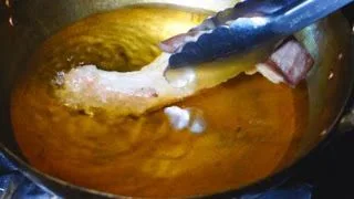 เวลาทอดมีเทคนิคนีดนึง ตาจะเอาส่วนหนังลงจ่อในน้ำมันร้อนก่อนค่ะ น้ำมันร้อนจัดนะคะ ทอดส่วนหนังให้กรอบหนังเขาจะฟูกรอบค่ะ แล้วค่อยหย่อนทอดทั้งชิ้นค่ะ