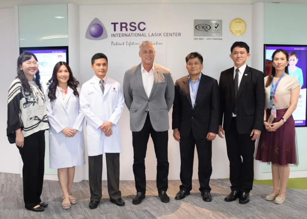 นพ.เอกเทศ ชันซื่อ ผู้อำนวยการแพทย์ (ที่ 3 จากซ้าย) และ สุชาติ เห็นสว่าง กรรมการผู้จัดการ (ที่ 3 จากขวา) TRSC ศูนย์เลสิคนานาชาติ ให้การต้อนรับทีมผู้บริหาร นำโดย Mr.Leo Mulder (คนกลาง) พร้อมคณะจากบริษัท STAAR Surgical AG ในโอกาสเข้าเยี่ยมชมศึกษาดูงาน และร่วมยินดีที่ TRSC มีทีมแพทย์ที่ทำการผ่าตัดสายตาผิดปกติด้วยการเสริมเลนส์ (PIOL) ในระดับแนวหน้าของประเทศไทย รวมทั้งเป็นศูนย์รักษาสายตาผิดปกติที่มีมาตรฐานระดับสากลเข้าสู่ปีที่ 21 ณ TRSC ชั้น 6 อาคารอื้อจือเหลียง