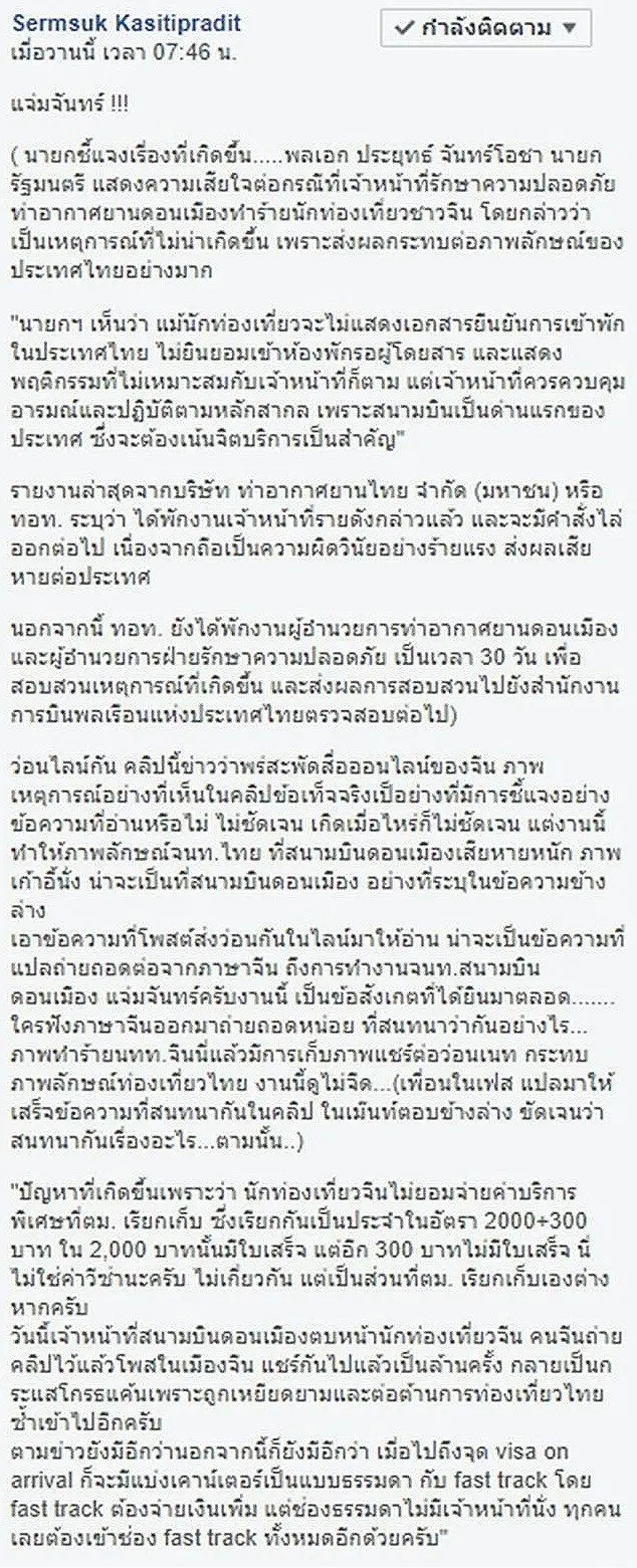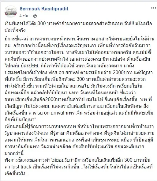 ต่อมาผู้ใช้เฟซบุ๊กที่ชื่อ Sermsuk Kasitipradit ก็ได้โพสท์คลิปเหตุการณ์ดังกล่าว พร้อมข้อความเพิ่มเติมอ้าง ว่า ปัญหาที่เกิดขึ้นเพราะว่า นักท่องเที่ยวจีนไม่ยอมจ่าย