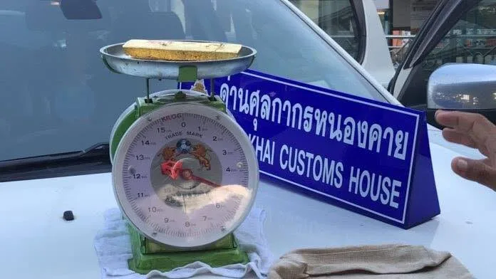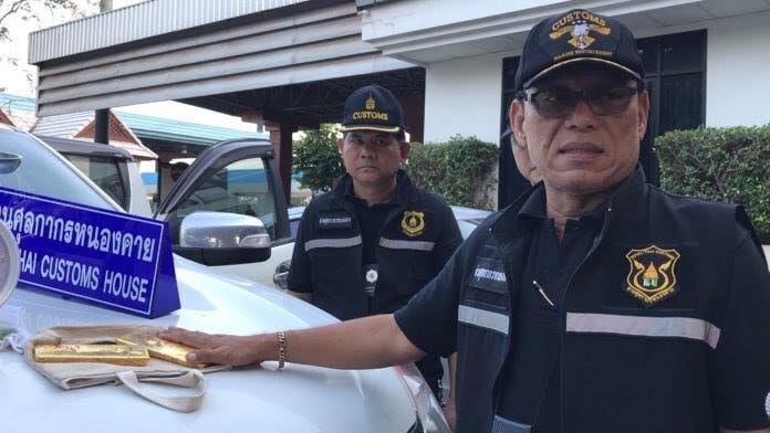 เมื่อวานนี้ (1 ต.ค.61) เวลา 17.00 น. ที่ด่านพรมแดนสะพานมิตรภาพไทย – ลาว แห่งที่ 1 อ.เมืองหนองคาย นายนิมิตร แสงอำไพ นายด่านศุลกากรหนองคาย พร้อมเจ้าหน้าที่ศุลกากรที่ปฏิบัติหน้าที่บริเวณด่านพรมแดน ได้ทำการตรวจสอบรถยนต์ที่เข้าออกประเทศ ซึ่งได้เรียกตรวจรถยนต์กระบะมาสด้า สีขาว 4 ประตู ทะเบียน กง 28 หนองคาย ที่ขับจากประเทศเพื่อนบ้านเข้าประเทศ โดยมีชายคนหนึ่งเป็นคนขับ มีผู้หญิงสองคนนั่งมาในรถ (เจ้าหน้าที่ขอสงวนชื่อและนามสกุลเพื่อทำการขยายผลการจับกุม) จากการตรวจสอบพบว่าบริเวณที่นั่งด้านหลัง หญิงสาวนั่งเหยียบถุงผ้าไว้ ท่าทางมีพิรุธ จึงขอตรวจสอบอย่างละเอียดพบว่าภายในถุงผ้านั้นมีทองคำแท่ง 2 แท่ง น้ำหนัก 2897.9 กรัม ส่วนอีกแท่งน้ำหนัก 2303.4 กรัม รวมน้ำหนักทองคำ 5201.3 กรัม หรือประมาณ 5 กิโลกรัม ประเมินราคาคิดตามเปอร์เซ็นต์ทองในประเทศไทยที่ 95 เปอร์เซ็นต์ ทองคำนี้จะมีมูลค่าประมาณ 5.2 ล้านบาท ซึ่งได้ควบคุมตัวทั้งหมดไว้ก่อน