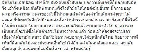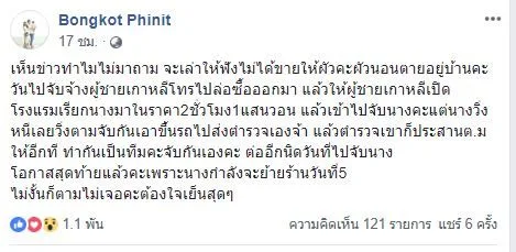 และล่าสุดเธอโพสต์อีกครั้งว่า เห็นข่าวทำไมไม่มาถาม จะเล่าให้ฟังไม่ได้ขายให้ผัวคะผัวนอนตายอยู่บ้านคะ วันไปจับจ้างผู้ชายเกาหลีโทรไปล่อซื้อออกมา แล้วให้ผู้ชายเกาหลีเปิดโรงแรมเรียกนางมาในราคา2ชั่วโมง1แสนวอน แล้วเข้าไปจับนางคะแต่นางวิ่งหนีเลยวิ่งตามจับกันเอาขึ้นรถไปส่งตำรวจเองจ้า แล้วตำรวจเขาก็ประสานต.มให้อีกที ทำกันเป็นทีมคะจับกันเองคะ ต่ออีกนิดวันที่ไปจับนาง โอกาสสุดท้ายแล้วคะเพราะนางกำลังจะย้ายร้านวันที่5 ไม่งั้นก็ตามไม่เจอค่ะต้องใจเย็นสุดๆ